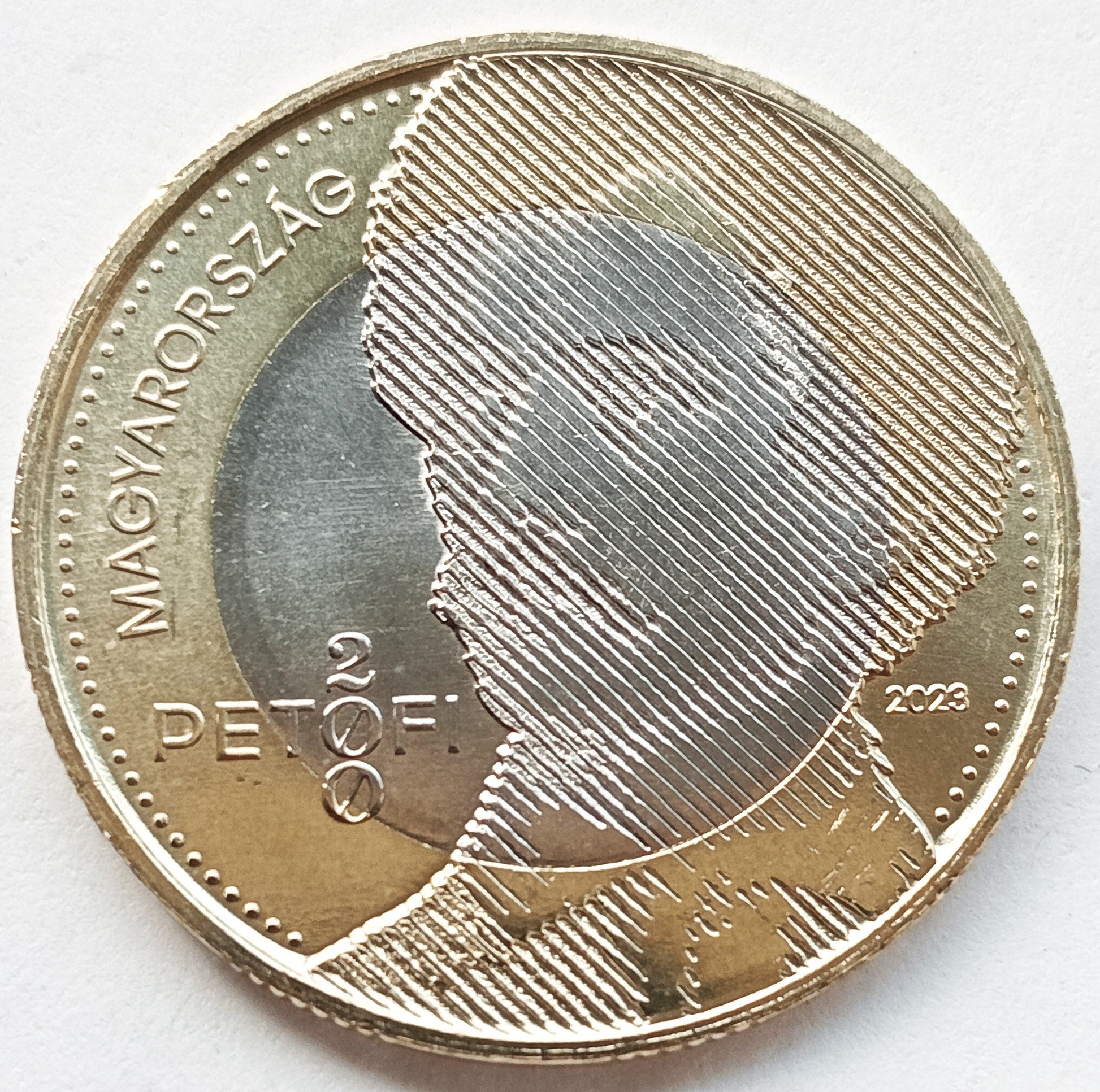 Awers: portret Sándora Petőfiego, motyw po lewej stronie w krzyżu PETROFI / 200(200 lat), data po prawej 2023. Po lewej nazwa stanu MAGYARORSZÁG (Węgry).