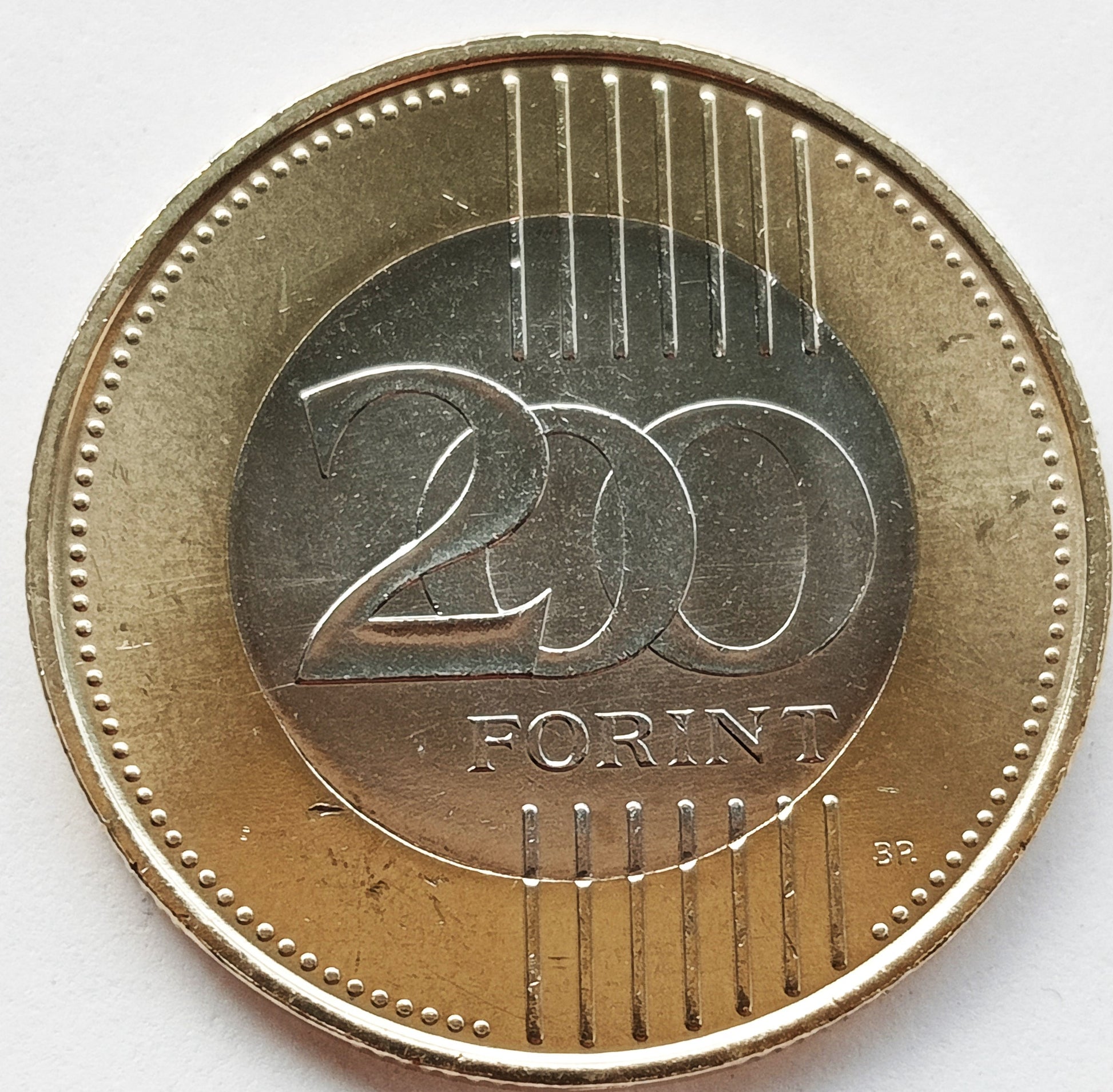 Rewers: W centralnym okręgu, nominał 200 FORINT. Siedem pionowych segmentów góra/dół, znak mennicy u dołu po prawej BP..