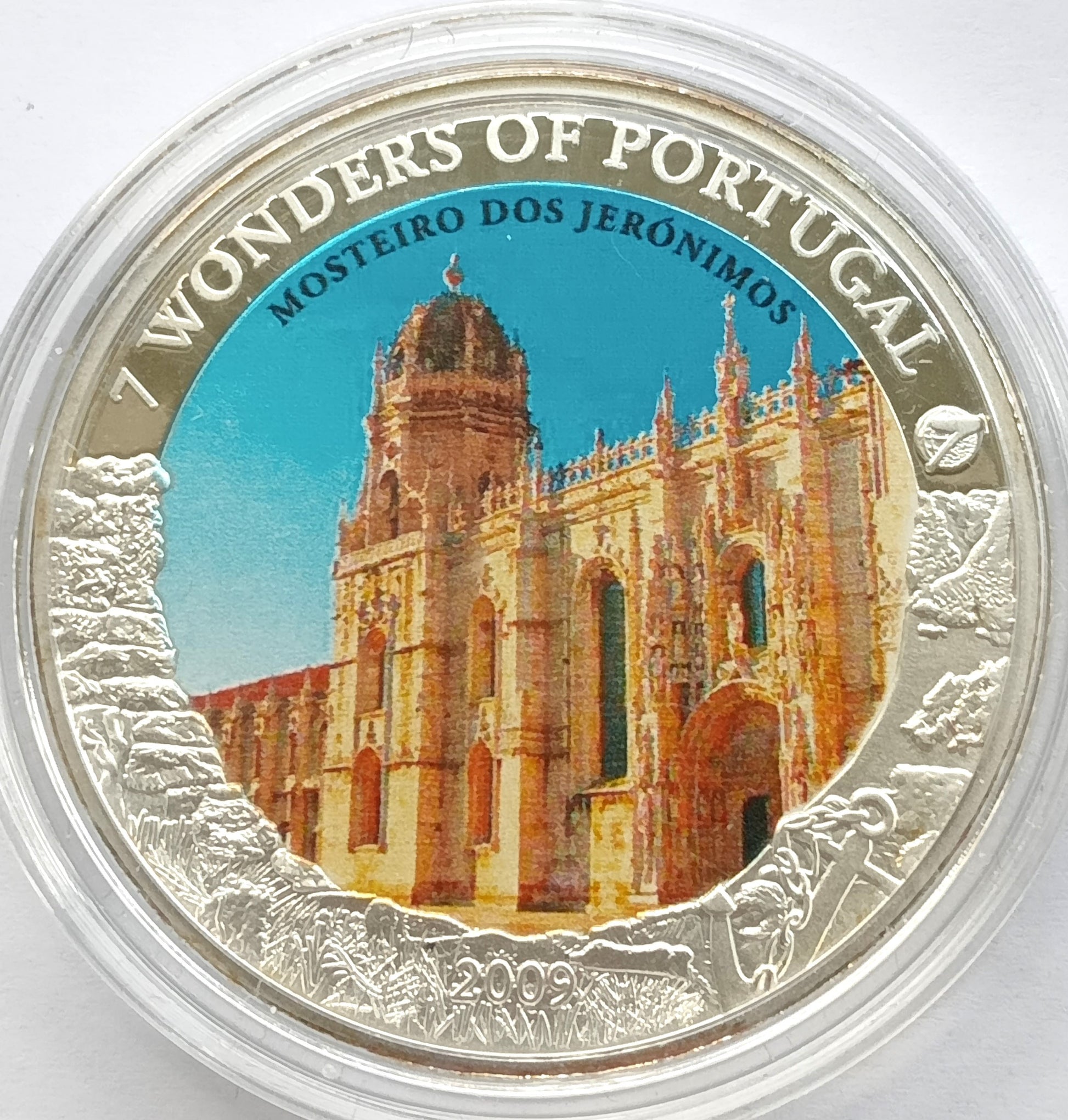 Rewers: Klasztor Hieronimitów w kolorze „MOSTEIRO DOS JERÓNIMOS”, data „2009”, nazwa serii i logo; „7 CUDÓW PORTUGALII